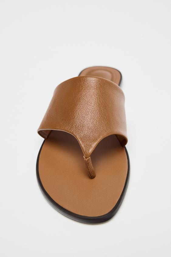 Flat leather sandal. Toe post. Flat sole. Round toe.