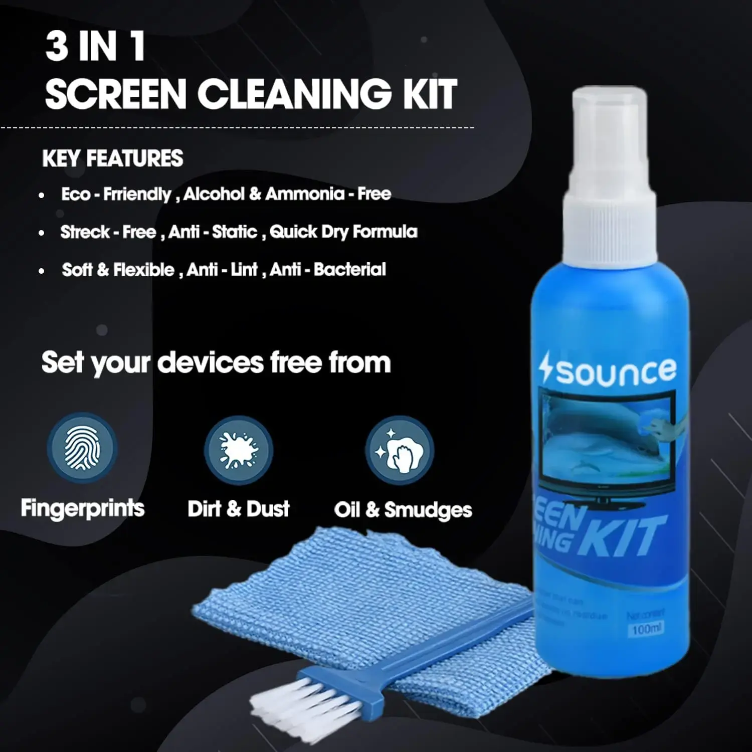 Sounce 3 in 1 Cleaning Set for Screen PC, Laptops, Monitors, Mobiles, LCD, LED, TV/Professional Quality/Prevents Static Electricity, 100ml with Micro Fiber Cloth and Soft Brush The Cleaning Kit is designed to be safe for use on most electronic devices. The cleaning liquid is alcohol-free and ammonia-free, which makes it safe for use on delicate surfaces, such as touchscreens and camera lenses. The soft-bristled brush is also gentle on the device's surfaces, ensuring that no scratches or damage is caused during cleaning.