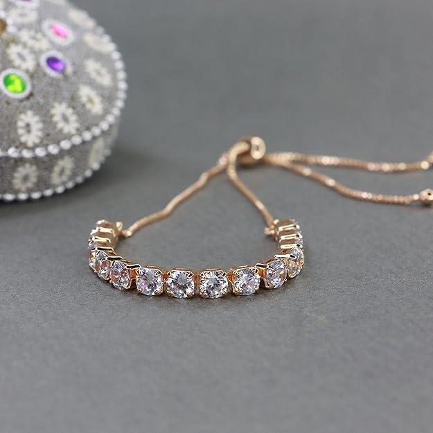 Material type : Rose Gold Plated Cubic Zirconia Bracelet Metal type : Alloy Clasp type : Push Button Size : Free Size Gem type : No Gemstone Occasion type : Wedding Country of Origin : India