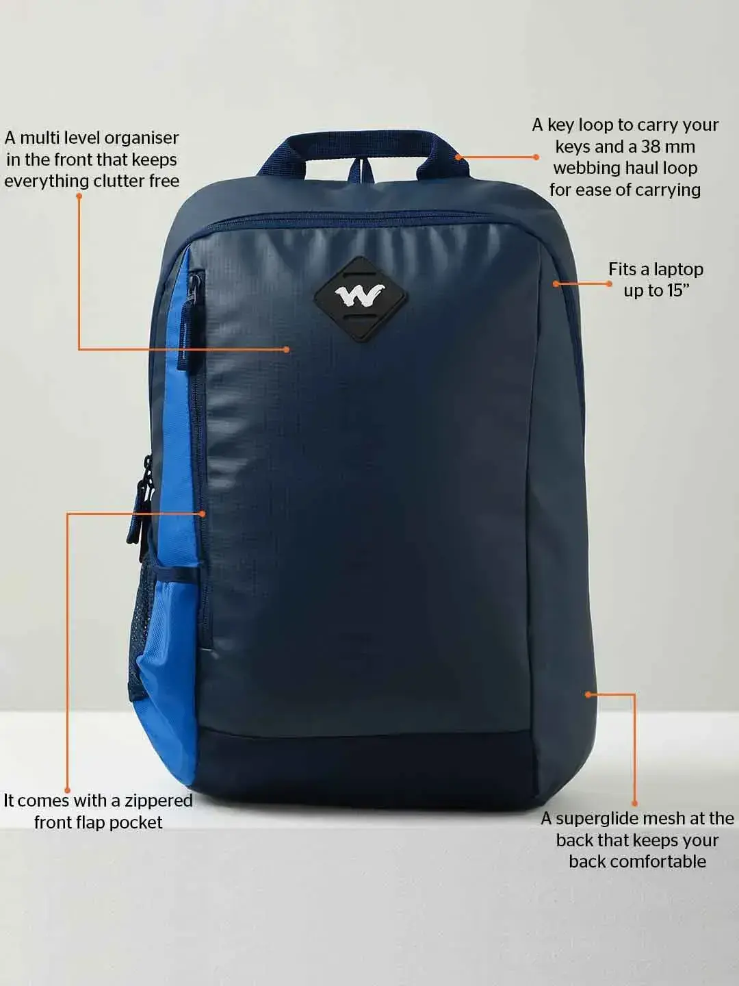 Multi-level organization for efficiency, fits laptops up to 15 inches, superglide mesh back for comfort, zippered front flap pocket for quick access