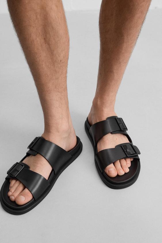 Sandals with two wide straps across the instep and buckle fastening. Anatomically shaped insole. Flat sole in a matching colour.
